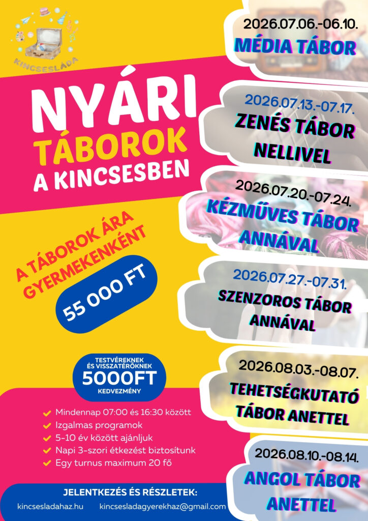 Idén nyáron is izgalmas táborokkal várjuk a gyermekeket a Kincsesláda Gyerekházban. Július 6-tól augusztus 14-ig 6 turnusban tartalmasabbnál tartalmasabb tematikákkal várjuk a gyermekeket.